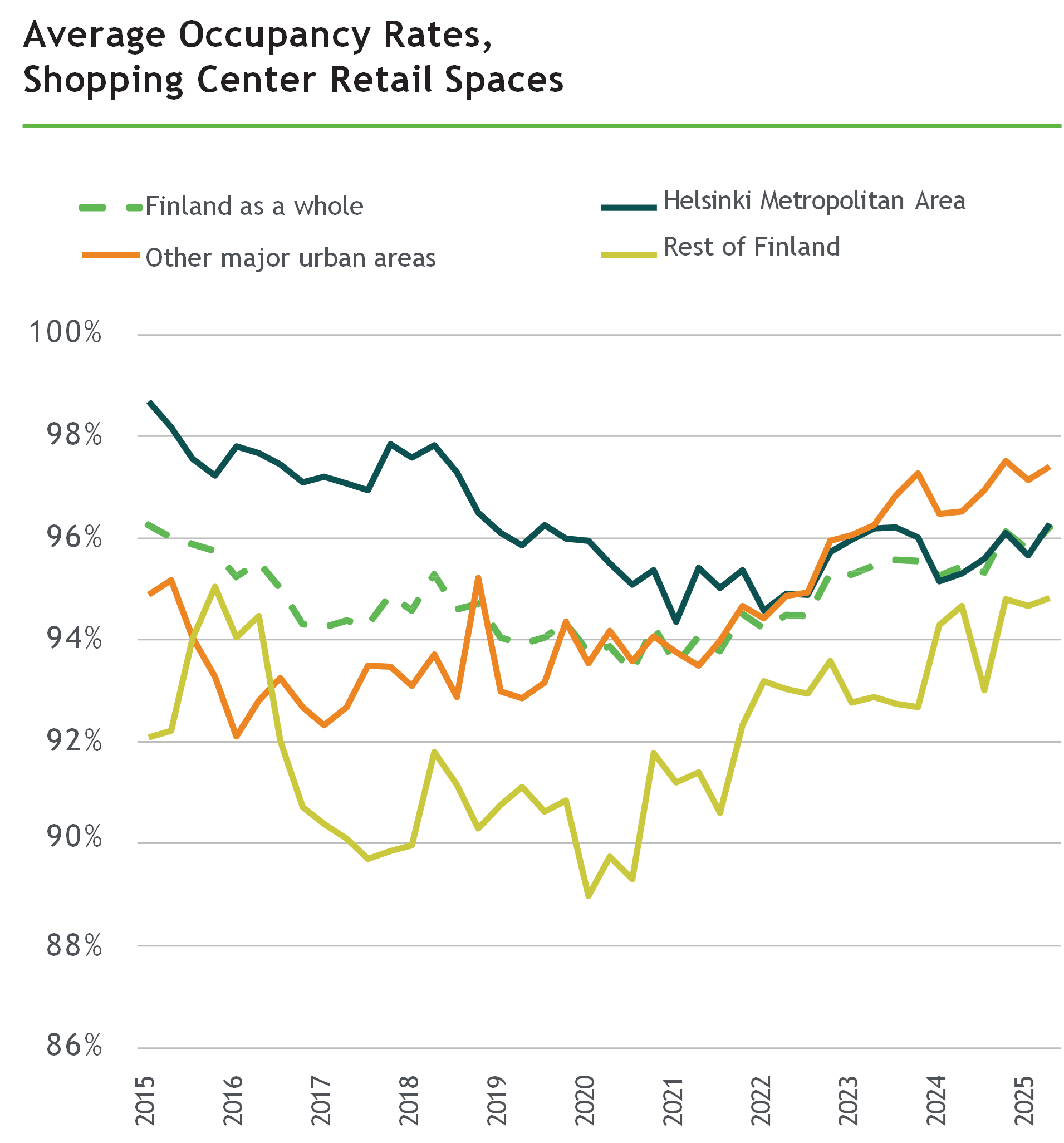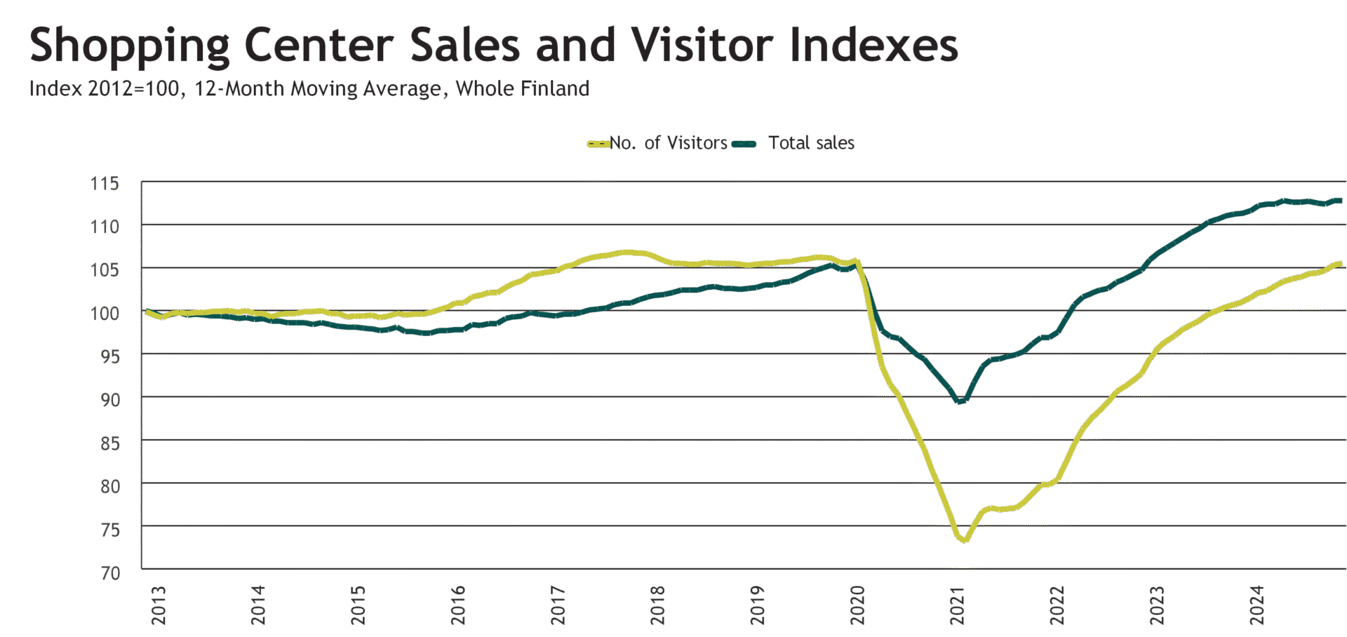 The Finnish shopping center market continues to outperform the broader retail sector, particularly in the Helsinki Metropolitan Area. Visitor numbers in shopping centers across Finland grew by 2.7% year-on-year in July–September, while in the Helsinki region both sales and visitor numbers increased by over 3%, according to statistics from the Finnish Council of Shopping Centers. Since the lows of the COVID-19 pandemic, sales and visitor indexes have developed steadily, and this positive trend is also reflected in the occupancy rates of shopping center tenants.