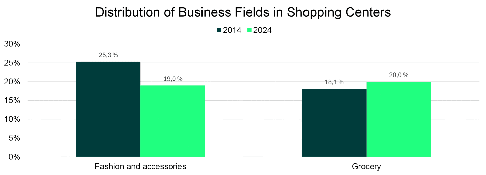 In contrast, sectors such as fashion, accessories, and leisure goods have shown signs of strain: sales in July–September were more than three percent lower than a year earlier. Fashion—once a key anchor for shopping centers—has lost ground. Between 2014 and 2024, fashion’s share of leased shopping center floor area dropped by several percentage points. Even so, fashion retailers still occupy a significant share of total leased space, and physical stores continue to play a central role in shaping the customer experience, especially in fashion. Today, however, grocery stores hold a slightly larger share of the leasable floor area.